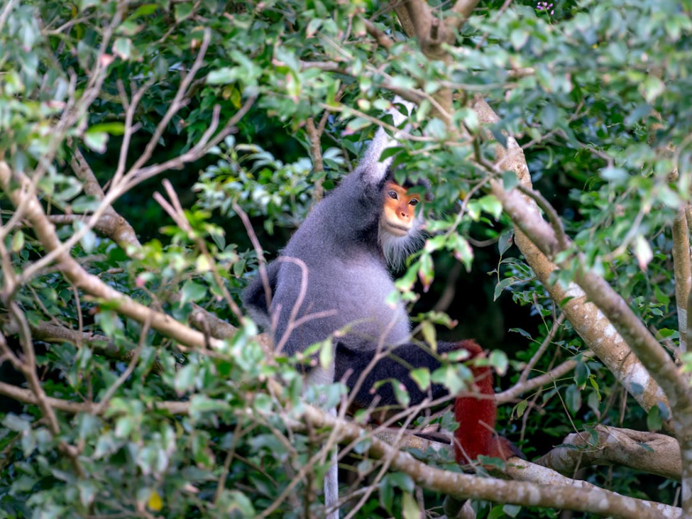 These primates are easily identified by their vivid red legs, white tails, and blue faces. They live in complex social groups and are known for their agility in the treetops.