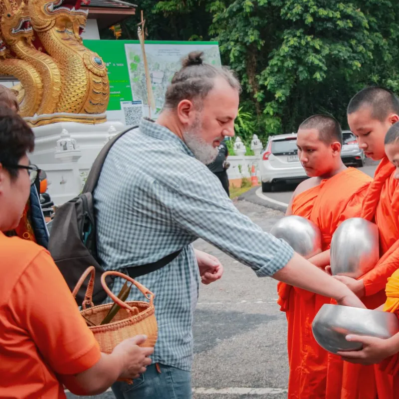 Morning light filters through the temple columns as monks gather in saffron robes. The air carries incense and the murmur of ancient Pali chants. This is not a performance for visitors. It is a sacred ritual, performed daily for generations. You are invited to participate. Kneel on the cool stone floor with palms pressed together. A monk begins to chant, his voice low and steady, words that have blessed countless souls before you. Another moves slowly down the line, stopping before each person.